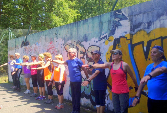 | Michèle nous indique des mouvements gymniques particuliers pour la marche nordique. |