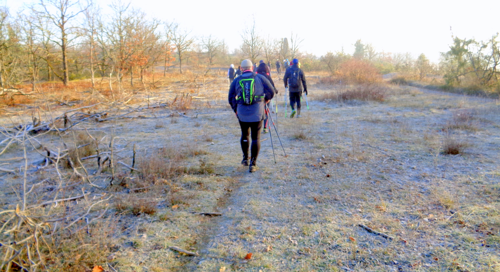 On se dirige au soleil pour les échauffements traditionnels de la marche nordique. |