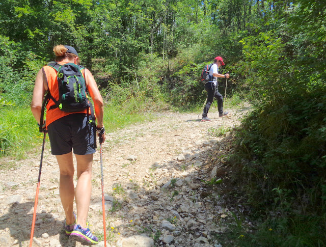 Muriel anima une marche nordique soutenue à partir de la Place de la mairie aux Junies, à 18h15, pour profiter d' un peu d'ombre dans les sous bois !